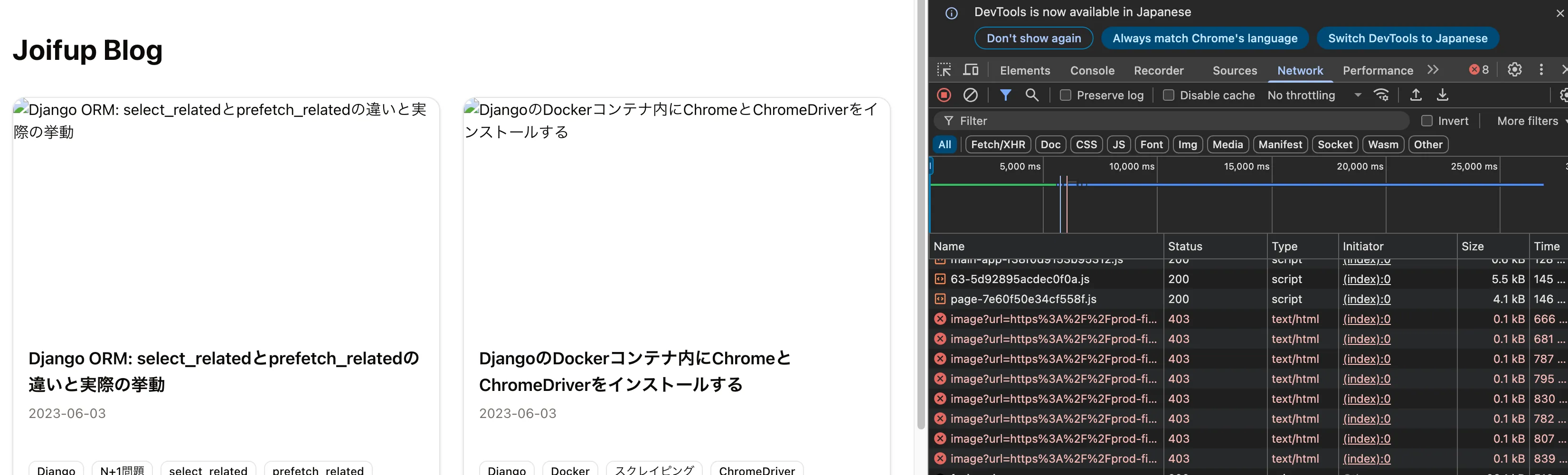 - DevToolsのネットワークログを見ると、画像のリクエストに対して 403 Forbidden エラーが返っている