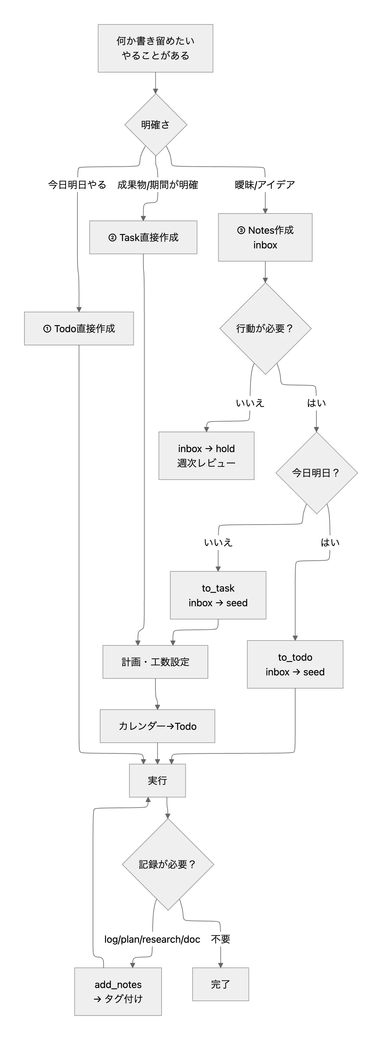 Notes作成(inbox)→ 行動判定 → 必要ならTask/Todo化(inbox → seed)