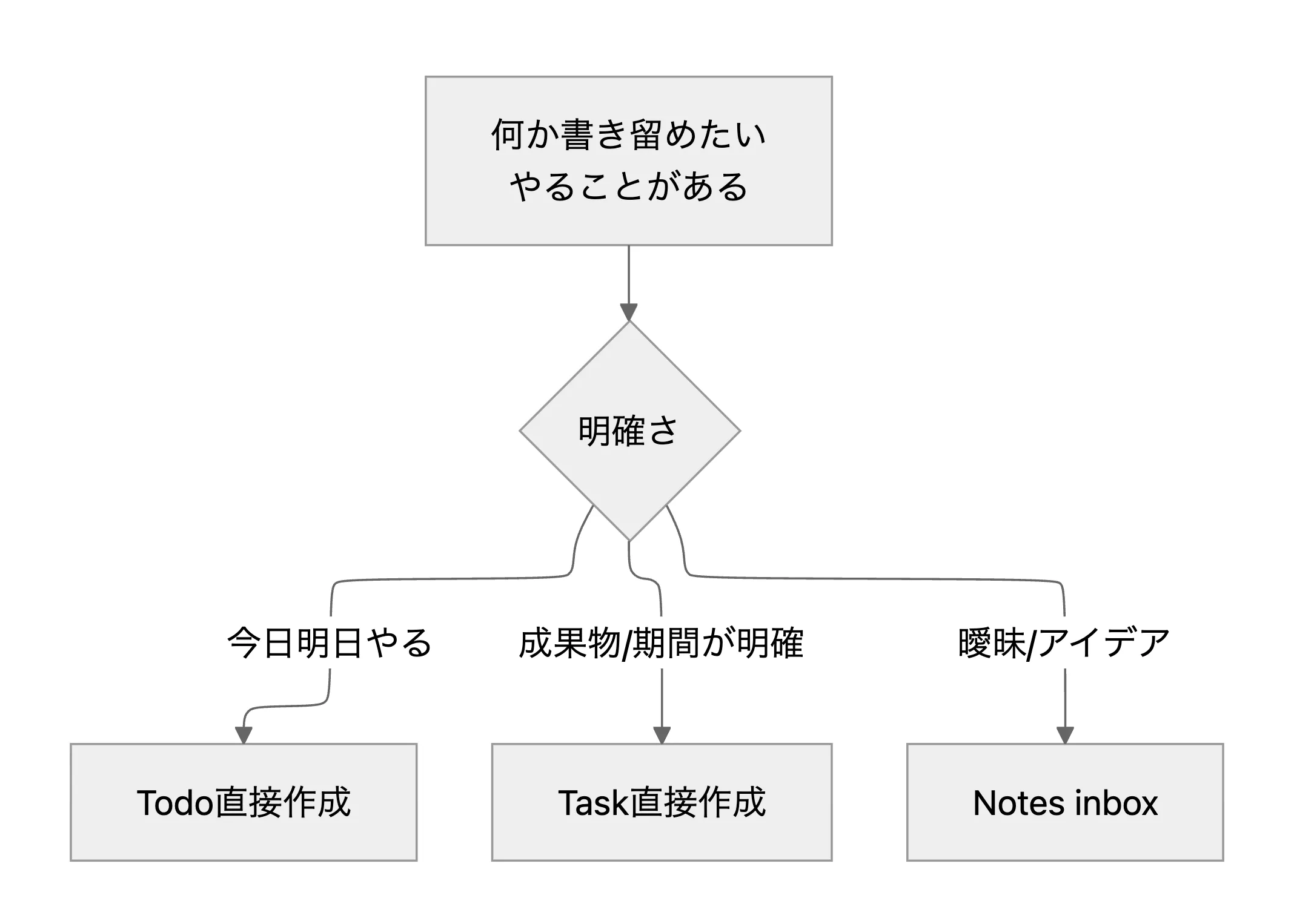 これはGTDの「まずキャプチャして、あとから振り分ける」という考え方を取り入れたもので、「これはTaskかな、Todoかな」と迷う時間を減らすのが狙いでした。